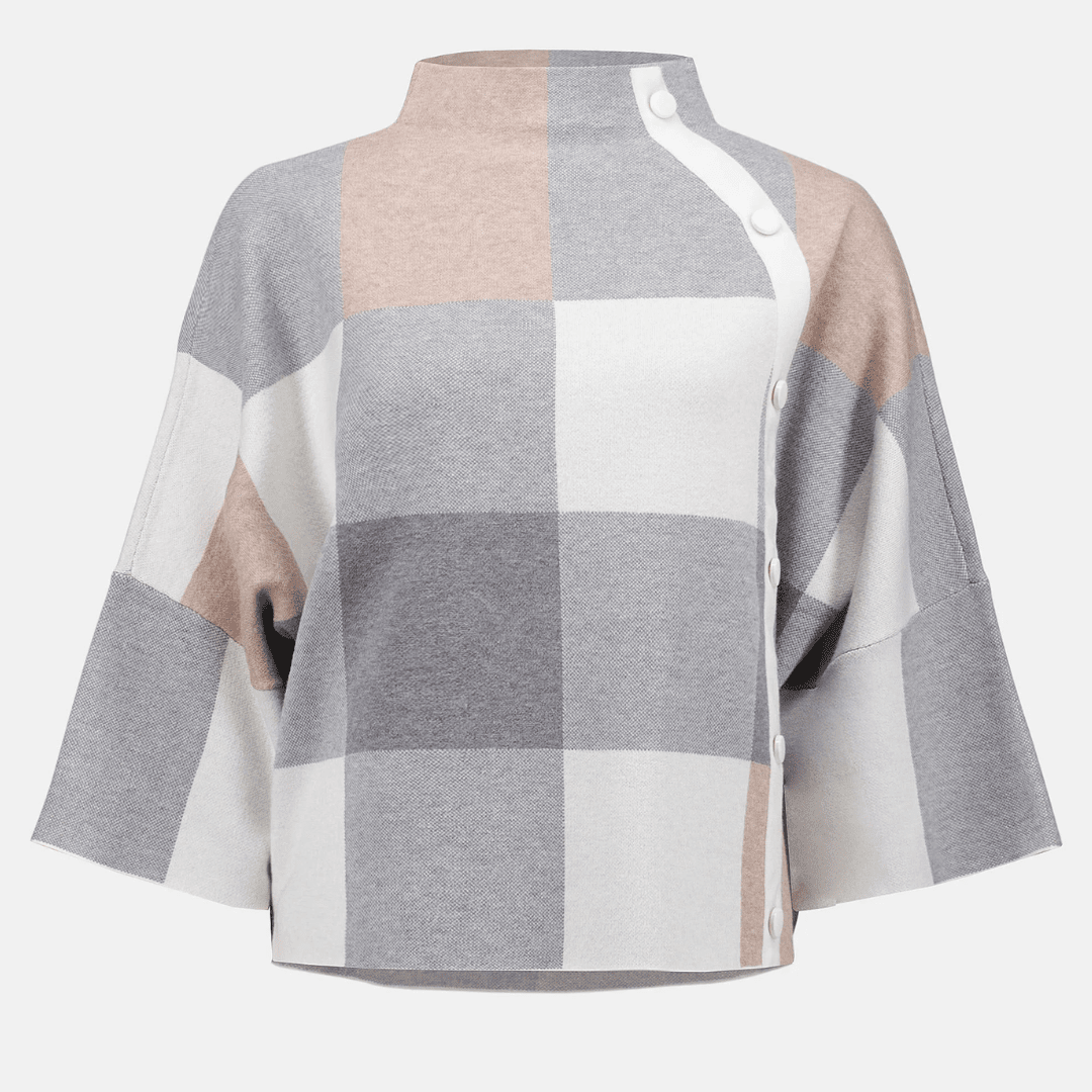 We all need a little plaid in our wardrobe. This cozy jacquard sweater knit top features a striking three-tone plaid pattern that's just as extraordinary as its design. A loose-fitting funnel neck adorned with decorative buttons on the side, along with three-quarter bell sleeves and a roomy fit give this piece an endlessly attractive appeal.