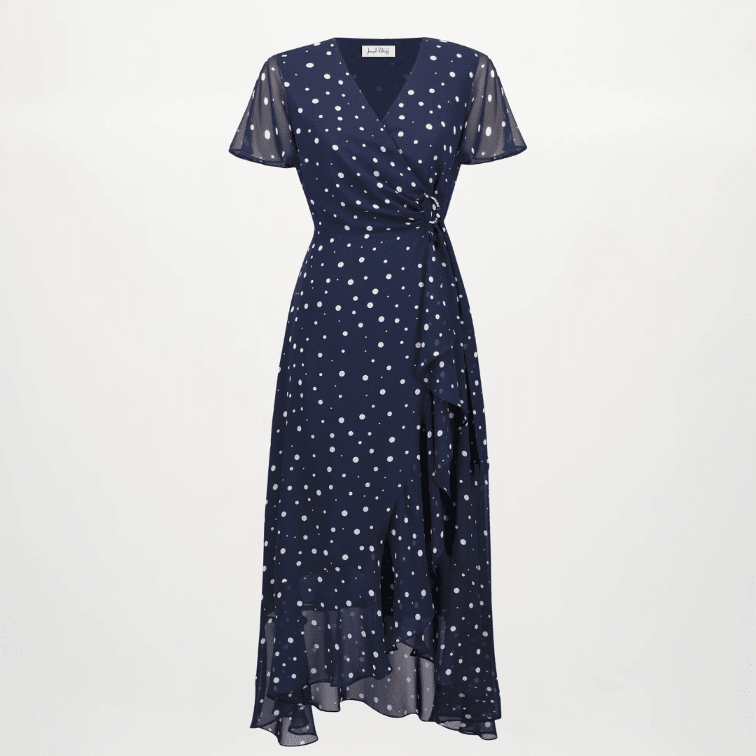 - Wrap neckline with ruffle edge
