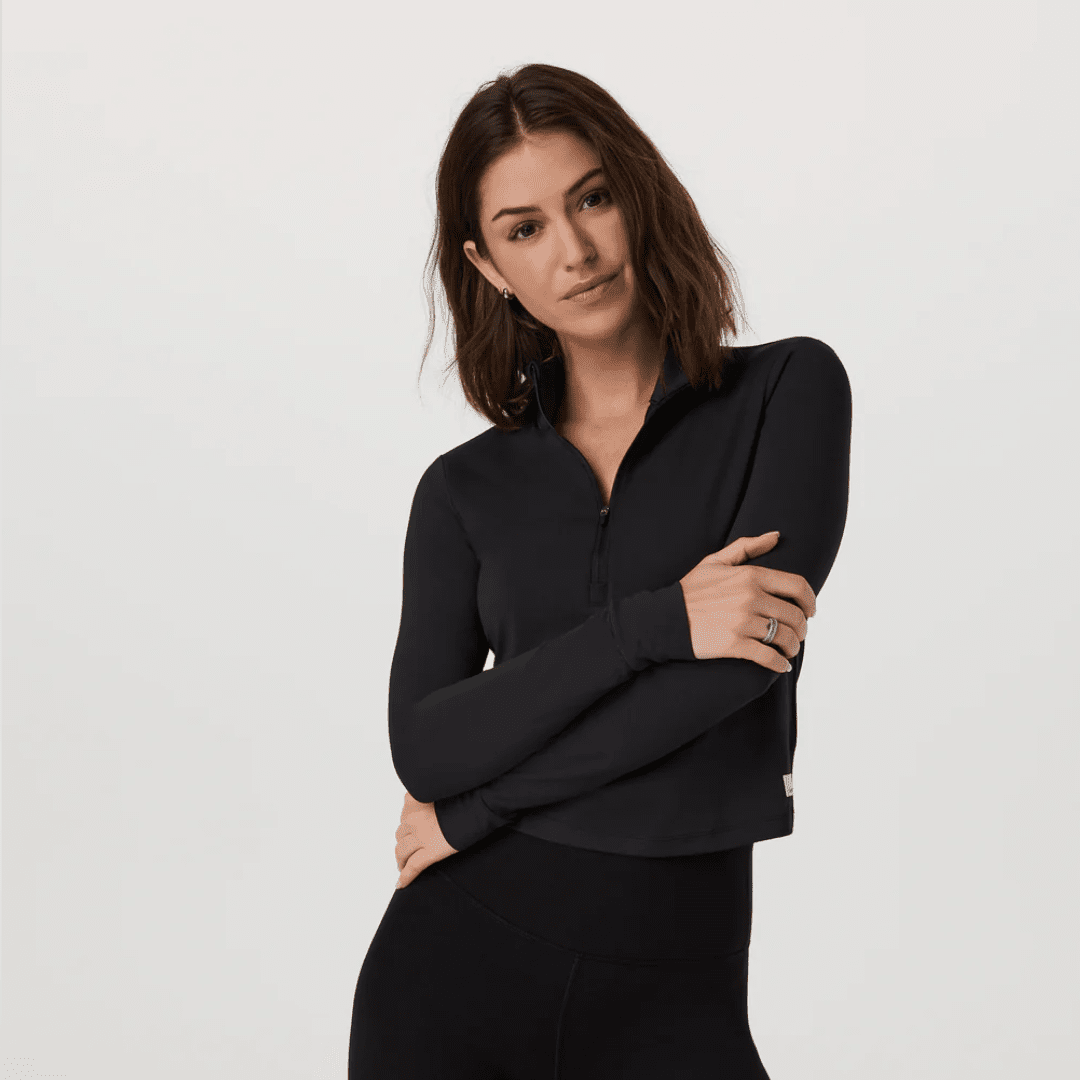 Customize your climate with the Studio Half Zip. With long sleeves and a mock neck, this fitted pullover is exactly what you need for warm ups, cool downs and the stretches in between.